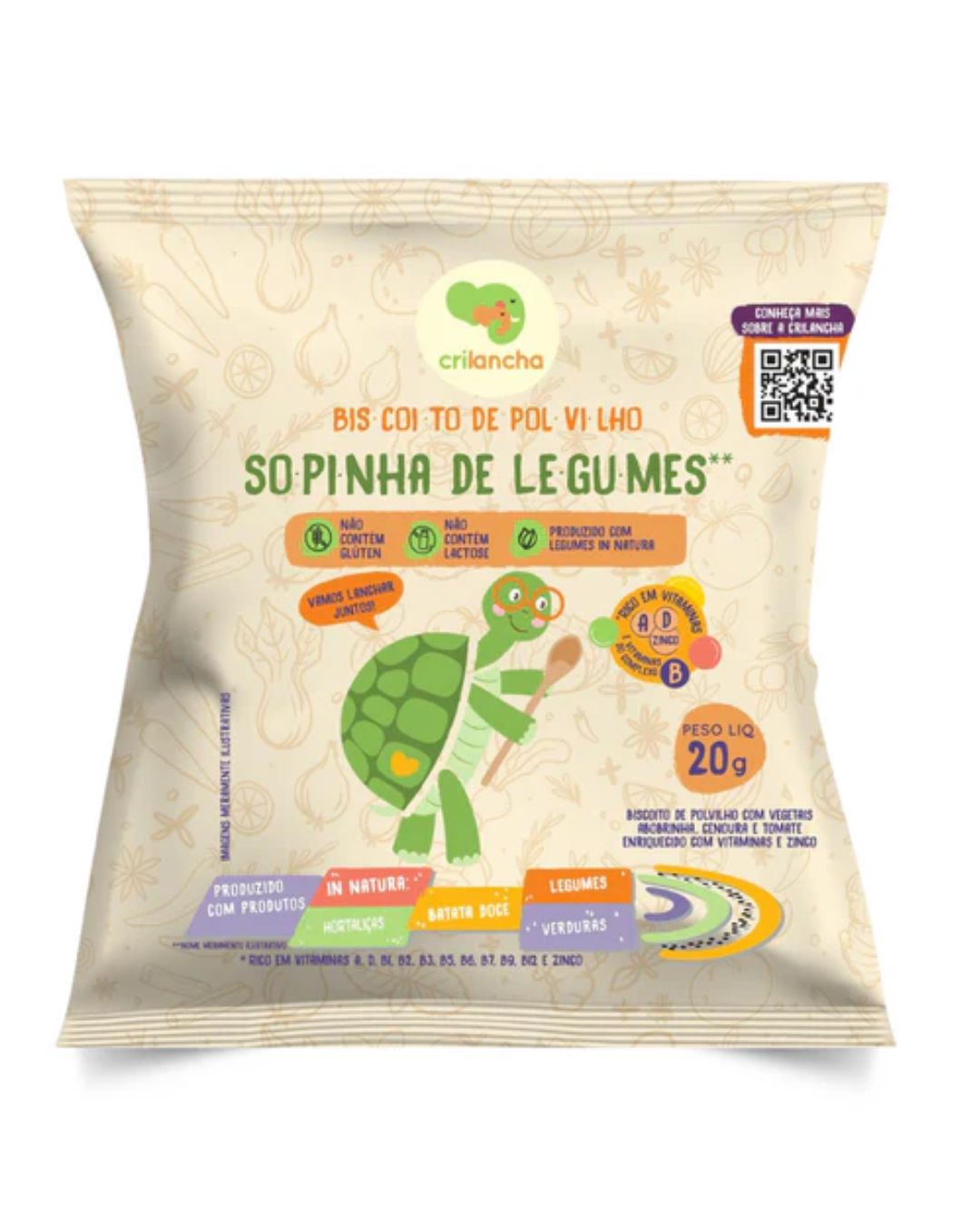 Ingredientes: Polvilho azedo, batata doce in natura, abobrinha in natura, gordura de palma, cenoura in natura, tomate in natura, cebola in natura, alho poró in natura, sal, louro, mix de vitaminas (vitamina A (acetato de retinol), vitamina D (ergocalciferol), vitamina B1(tiamina), vitamina B2 (riboflavina), vitamina B3 (niacina), vitamina B5 (ácido pantotênico), vitamina B6 (piridoxina), vitamina B7 (biotina), vitamina B9 (ácido fólico), Vitamina B12 (cianocobalamina) e Mineral (Zinco (sulfato de zinco). NÃO CONTÉM GLÚTEN.